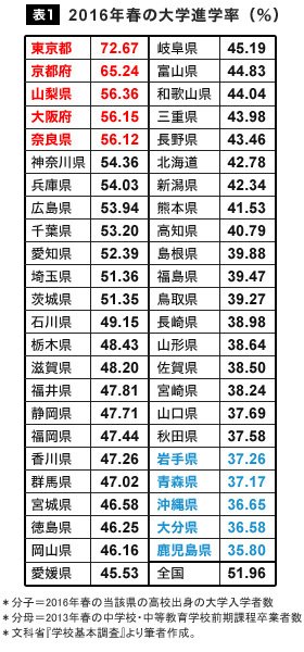 一方、地方は大学が少なく、大学に進学しようという生徒の多くは地域移動(下宿)を強いられる。バカ高の学費に加えて、下宿のコストも課されるわけです。所得水準の低い地方の家庭にとって、この負担はとてつもなく重いでしょう。大学進学率が低い県の顔ぶれ(表1)をみると、さもありなんです。