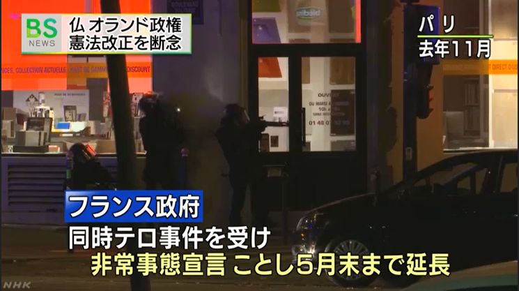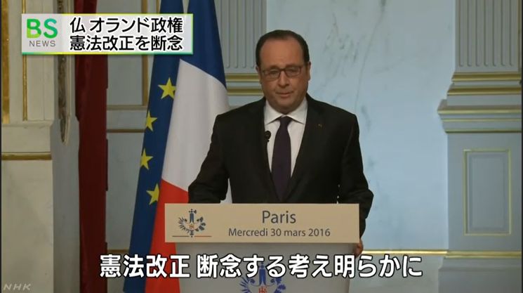 フランスのオランド政権は、去年パリで起きた同時テロ事件を受けて、非常事態宣言を憲法に明文化するなど、憲法の改正案を議会に諮っていましたが、議会で合意に至らず、憲法改正を断念しました。
