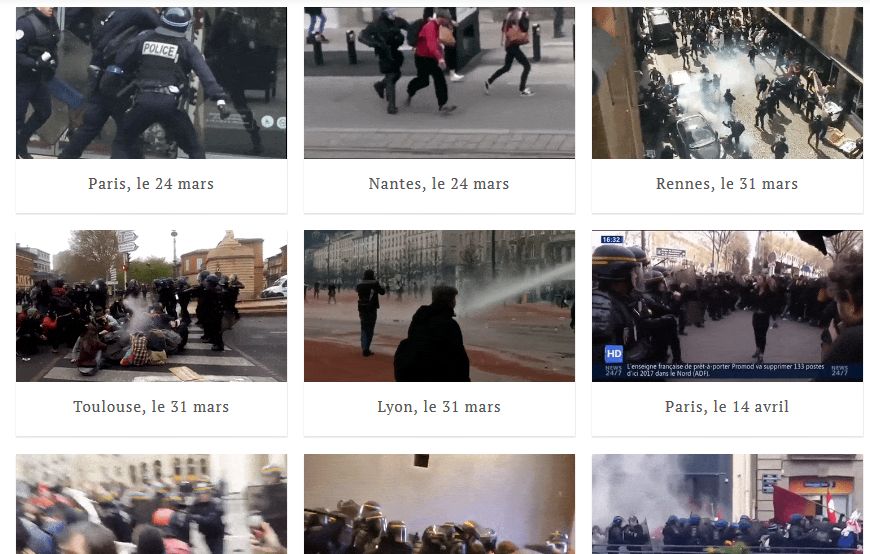 パリ、リール、ナント、リヨン、レンヌ、アミアン、トゥールーズ、や他の都市で、数えきれないビデオが撮られている。アマチュアやセミプロの一般市民が労働法反対デモ参加者に対する警察の暴力の現場を撮影しています。メディアパールはその中から