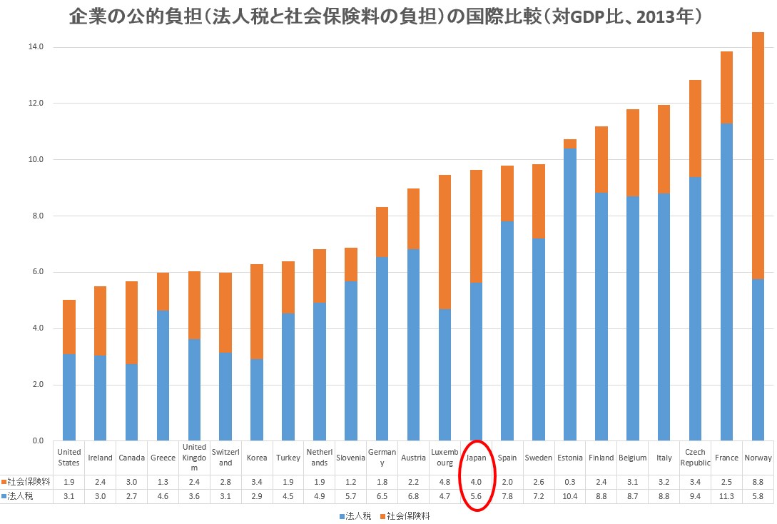 2013年のデータがある23カ国の中で、日本は10番目です。フランスの「企業の公的負担」は日本の1.4倍も重いのです。