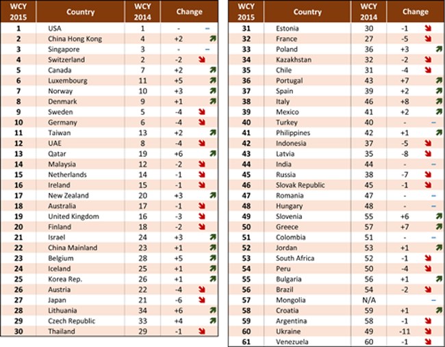 IMD(経営開発国際研究所)による2015年世界競争力ランキング