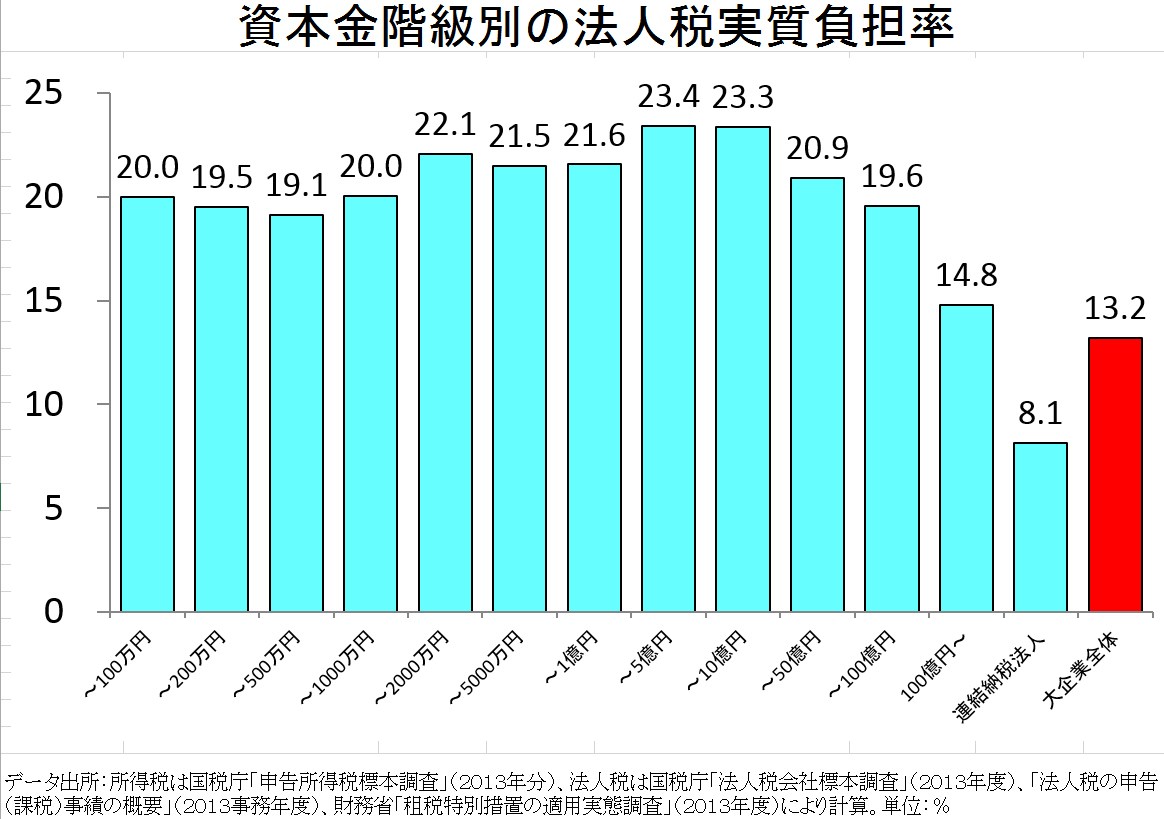 経団連や安倍政権は、日本の法人税は諸外国に比べて高いと言っていますが、それは名目の法人税率だけです。実際の大企業の法人税負担率は優遇措置があるため下のグラフや表にあるように、大企業全体で13.2%と中小企業よりも低くなっています。