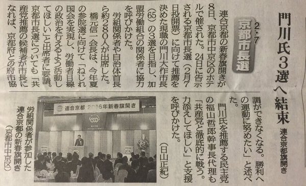 なんと、連合京都の旗開きで、あの民主党・福山哲郎議員が、2月7日に投開票をむかえる京都市長選について、「共産党と徹底的に戦う」と宣言したというのです。連合京都と民主党は、現職で自公推薦の門川大作市長を推薦する方針を決めており、共産党は本田久美子氏を推薦しています。福山議員の発言は、そうした事情を背景とするものです。京都新聞が報じました。