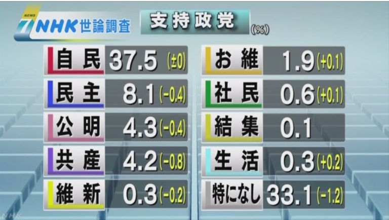 NHKの世論調査によりますと、各党の支持率は、自民党が37.5%、民主党が8.1%、公明党が4.3%、共産党が4.2%、維新の党が0.3%、おおさか維新の会が1.9%、社民党が0.6%、改革結集の会が0.1%、生活の党と山本太郎となかまたちが0.3%、▽「特に支持している政党はない」