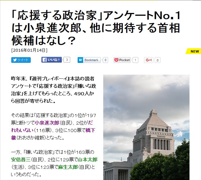 【週プレ読者アンケート】「応援する政治家」1位小泉進次郎2位なし3位橋下徹「嫌いな政治家」1位安倍晋三2位山本太郎3位麻生太郎