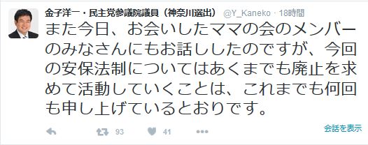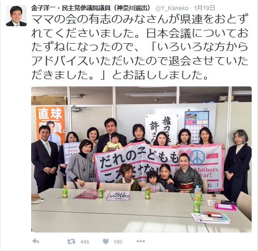 民主党・金子洋一議員、日本会議を退会したとのこと。これからはママの会とともに、平和安全法制(戦争法)廃止のために頑張るのでしょうか。 pic.twitter.com/WcgDQ723HK