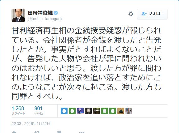 田母神俊雄氏が甘利氏を庇い「渡した方が罪に問われないのはおかしい」とツイート。ネットでは「贈賄罪(ワイロ贈った方も当然罪)知らねーのか」とフルボッコに!