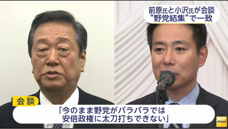 【朗報】民主元代表前原氏と生活代表小沢氏が会談!参院選野党結集で一致!市民連合の山口二郎氏も同席