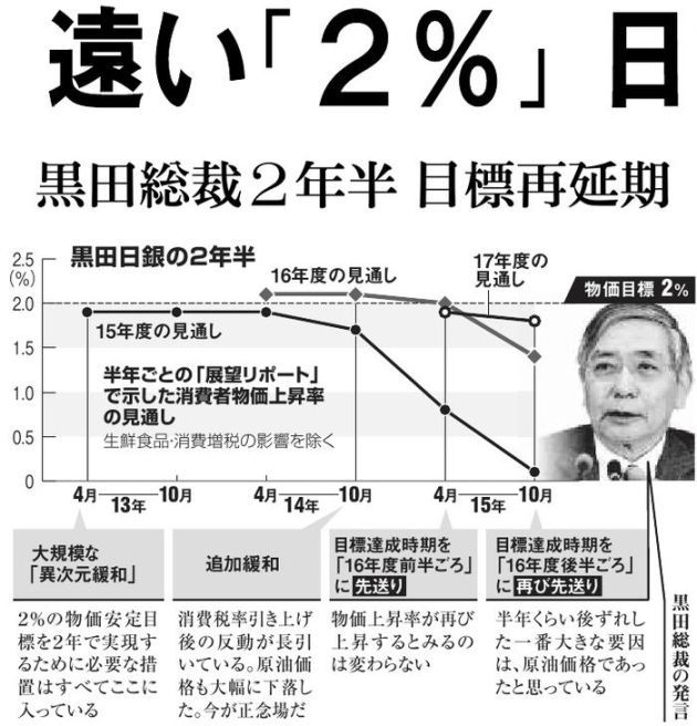 2年前の13年4月4日に、黒田日銀は本格的なインフレ目標政策を採用し、消費物価の前年比上昇率2%(消費税率引き上げの影響を除く)を、今後2年程度のできるだけ早い時期に実現するという目標を掲げた。この目標達成にために「量的・質的金融緩和(QQE)」政策を開始、これが黒田バズーカ砲である。しかし、現時点で2%のインフレ目標が達成できないことはほぼ確実となっている。