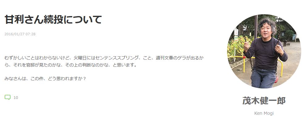 茂木さんも疑問に思ってますが、甘利氏の続投はどういった意味があるのでしょうか。国民の7割が対応に納得できないとしている中での続投ですから、政権へのダメージは大きくなる可能性が高いでしょう。それでもなお、続投させようという事は裏に何かあると見るのが妥当でしょうか。