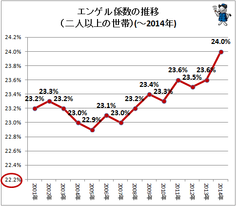 2014年に、エンゲル係数が25%超えたんだな。明治以来100年以上にわたる近代化の流れがついに変わったのか