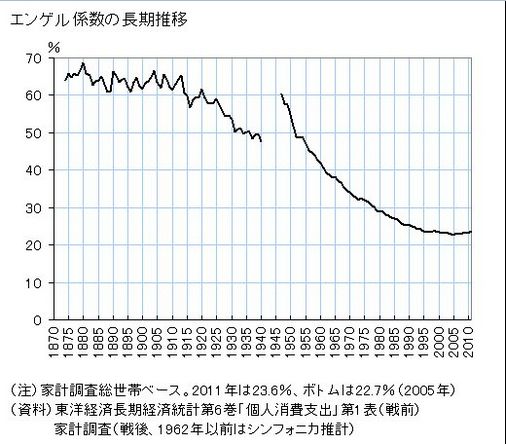 1870年の統計以来、エンゲル係数は戦時期を除いて一貫して低下してきた。90年代以後は、ゼロ成長下で停滞したが、近年じわりと上昇しはじめ、ついに25%を超える時期がではじめた。 pic.twitter.com/ZL1R6YvXlG