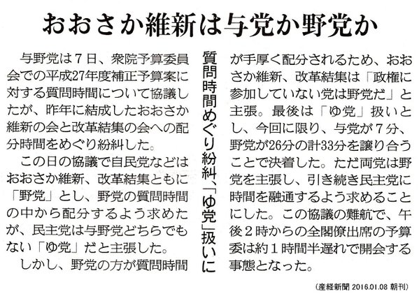 【ゆ党】おおさか維新は甘利大臣辞任について国会で追及せず!「予算やTPPが一番、国民の生活に直結する」←「決めた大臣が汚職まみれじゃ話にならんでしょ」