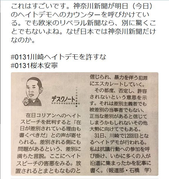 川崎のヘイト(差別)デモ反対行動への参加を神奈川新聞が呼びかけ⇒地元の人が立ち上がり大カウンターで差別主義者を撃退!