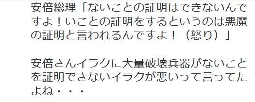【矛盾】安倍総理「ないことをないと証明するのは『悪魔の証明』だからできない」⇒イラクに大量破壊兵器がないことを証明させる『悪魔の証明』を求めたアメリカを支援