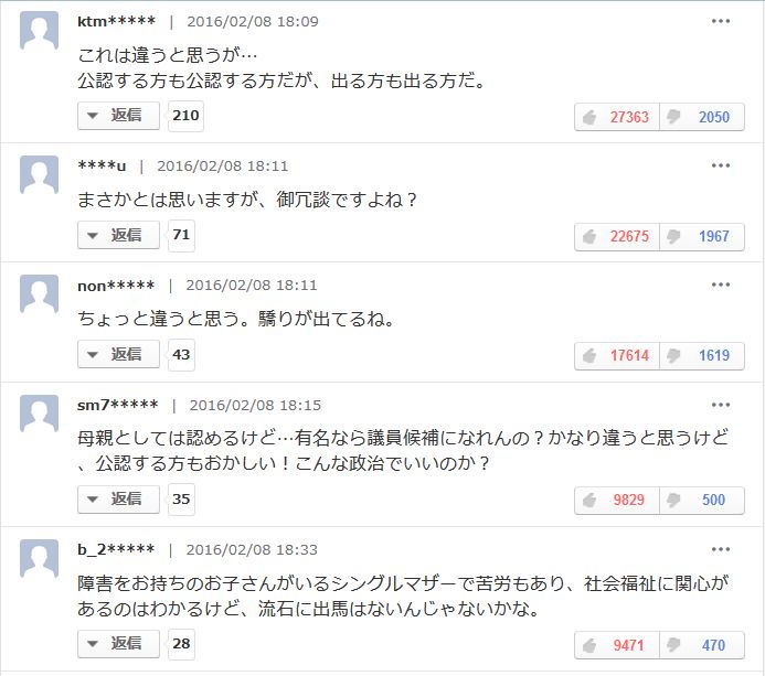これはどういった経緯での出馬か非常に気になります。今のところ、自民支持者も非支持者も否定的な意見が多いようです。明らかに逆風の中での出馬ですから、相当な経緯・決意があると思われます。ファンの中で一部肯定論もありますが、「一生ついていく」系の宗教ですので話になりません。