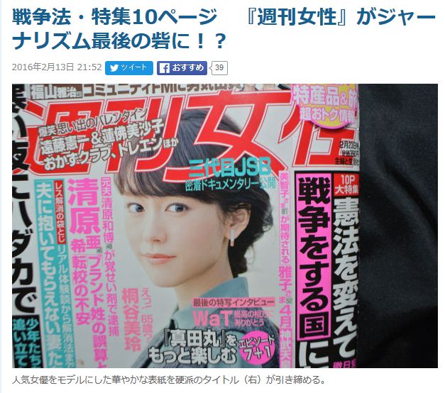 「戦争法の強行採決から早や5ヶ月。国会周辺を歩いても抗議の人影はない。忘れやすい日本人。戦争法制に続いて自民党が狙う改憲案の恐ろしさに警鐘を鳴らす特集を組んだのは、今週発売された『週刊女性』(2月23日号)だ。」
