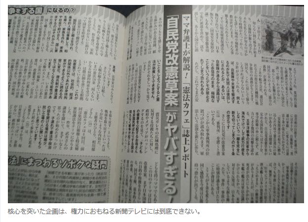政権におもねって、戦争法制反対を唱えるキャスターを交代させるTV局。緊急事態条項の恐ろしさを記事にしない大新聞。全国津々浦々まで行き渡り、戦争法制と改憲案に警鐘を鳴らす最後の砦は、女性週刊誌になってしまうのかもしれない。
