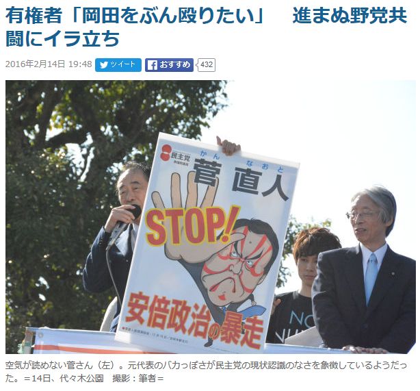 田中龍作ジャーナル | 有権者「岡田をぶん殴りたい」 進まぬ野党共闘にイラ立ち https://t.co/UjqJFBTZ15 岡田代表を殴っても何も変わらず、菅直人氏のズレ加減も不変。民主党って続いているのが不思議。そして、安倍政権支持していてもイイことないよ、右翼の皆さん。