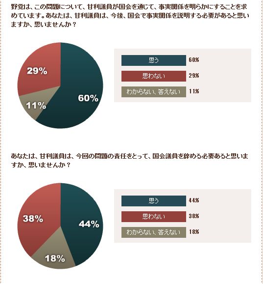 甘利前大臣への評価はお涙ちょうだい会見の後よりも、かなり厳しくなっているようです。議員辞職をすべきだという声は半数になり、すべきではないという声は4分の1にまで減りました。睡眠障害で休養と言う説を大半の国民は信じていないという事ではないでしょうか。