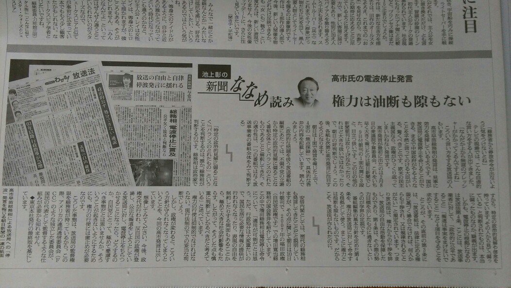 (池上彰の新聞ななめ読み)高市氏の電波停止発言 権力は油断も隙もない:https://t.co/EO2cHYwiSH