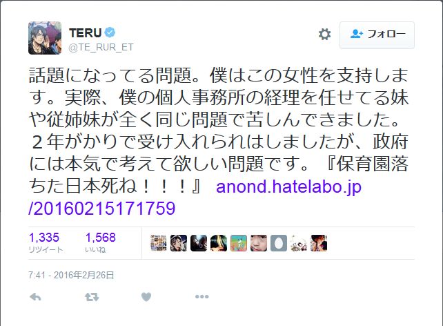 【政府を本気にさせるには?】GLAYのテルさんが「保育園落ちた日本死ね」の問題に言及!「政府には本気で考えて欲しい問題です」