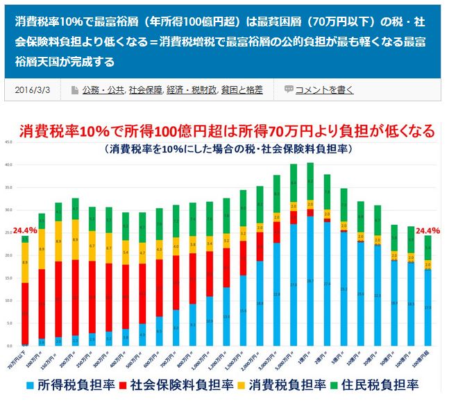 消費税率10%で最富裕層(年所得100億円超)は最貧困層(70万円以下)の税・社会保険料負担より低くなる=消費税増税で最富裕層の公的負担が最も軽くなる最富裕層天国が完成する https://t.co/2HFQEc5AiZ