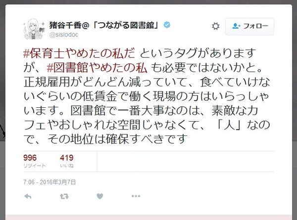 これに対し、図書館の事情に詳しい元産経新聞記者の猪谷千香さんが2016年3月7日に「#図書館やめたの私だ」のハッシュタグを作り、今度は図書館員の声を集め始めた。