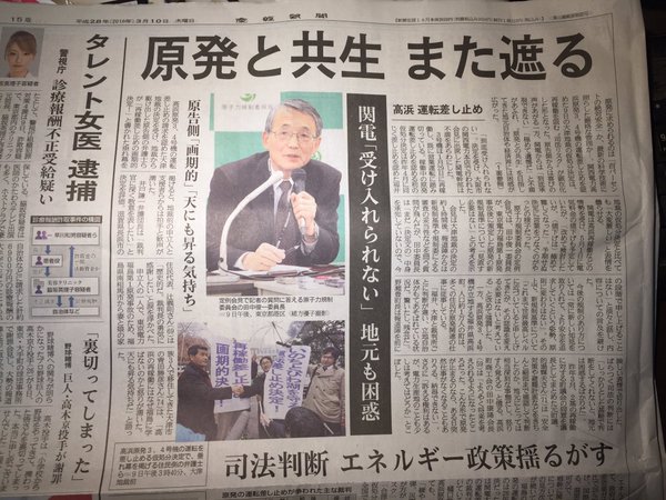 【原発と共生】3月10日の産経新聞の見出しが酷すぎると話題に。高浜原発稼働差し止めを受けて。
