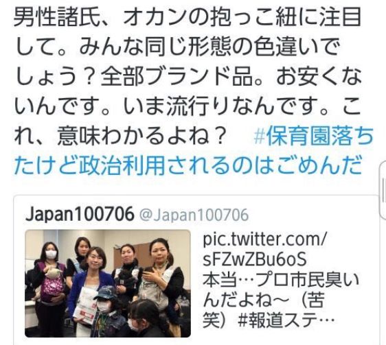 何だ、このくだらない難癖のつけ方。お金がなくて保育園に預けられないと訴えてる訳じゃなくて、会社勤めをやめざるを得ない!と母親は訴えているのに..「「『保育園落ちた』の署名を渡したママはブランド品の抱っこ紐を使ってるからプロ..」 https://t.co/XLzuW2sy1y