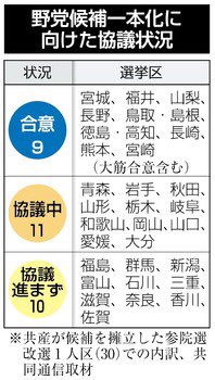 【野党共闘】参院選1人区。9選挙区で合意、11選挙区で協議、10選挙区で協議進まず