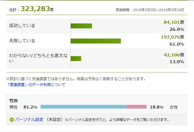 323,283票【結果】アベノミクスは成功? 失敗? - Y!ニュース意識調査 https://t.co/MRHmqJYQkb