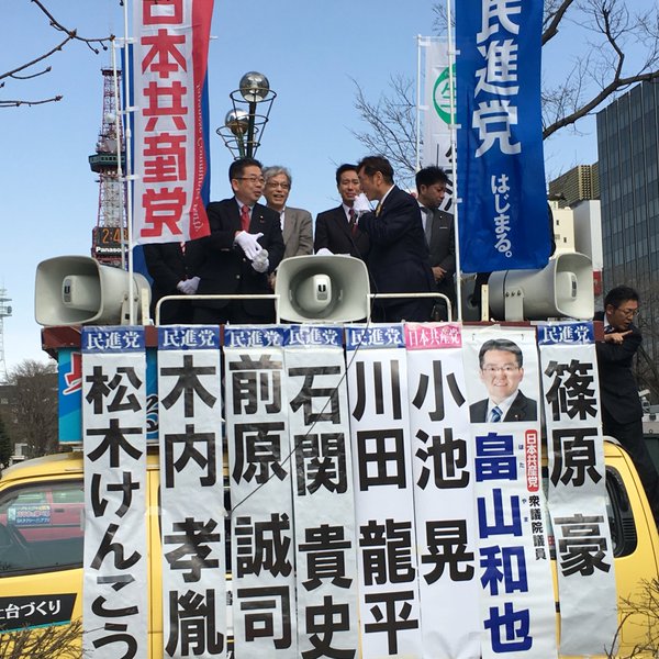 札幌駅前野党共同街宣。松木謙公さんが司会。民進党から山尾志桜里、細野豪志、前原誠司、原口一博、石関貴史、篠原豪、木内孝胤。共産党から私と穀田恵二、紙智子、笠井亮、畠山和也、梅村さえ子。生活の党から山本太郎各氏が訴えました。事件です。 pic.twitter.com/SoQSRu2Diw