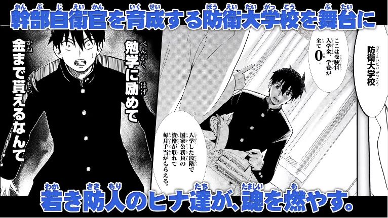 「学費無料で給料も出る防大は、こんなに魅力的な進学先ですよ」とマンガはささやく。
