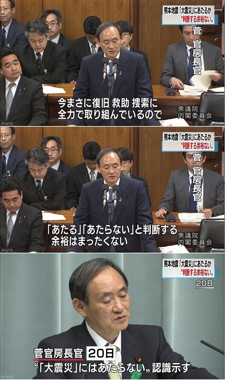 8日前に発言した内容は記憶にないらしい。菅官房長官、「大震災」に当たるかどうかについて、「復旧、捜索に全力で取り組んでおり、判断する余裕はない」と述べ、言及を避けた。https://t.co/MZQdUPDe4t pic.twitter.com/E4urwKobee