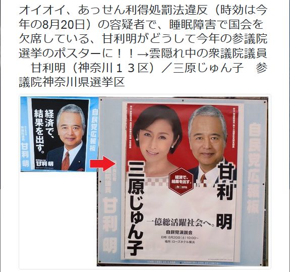 オイオイ、あっせん利得処罰法違反(時効は今年の8月20日)の容疑者で、睡眠障害で国会を欠席している、甘利明がどうして今年の参議院選挙のポスターに!!→雲隠れ中の衆議院議員 甘利明(神奈川13区)/三原じゅん子 参議院神奈川県選挙区pic.twitter.com/LjMRfGMl65