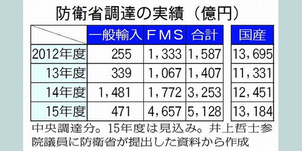 安倍晋三政権が米国製の高額武器を“爆買い”しています。日本共産党の井上哲士参院議員の調べによると、米国政府から武器を購入する有償武器援助(FMS)の金額は、安倍政権発足時2012年度の1332億円から、15年度(見込み)には4657億円へと3・5倍に急増しました。FMSとは別に、外国企業から武器を購入する一般輸入とあわせると、15年度の海外からの武器購入額は5100億円を超えます。