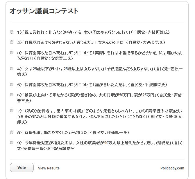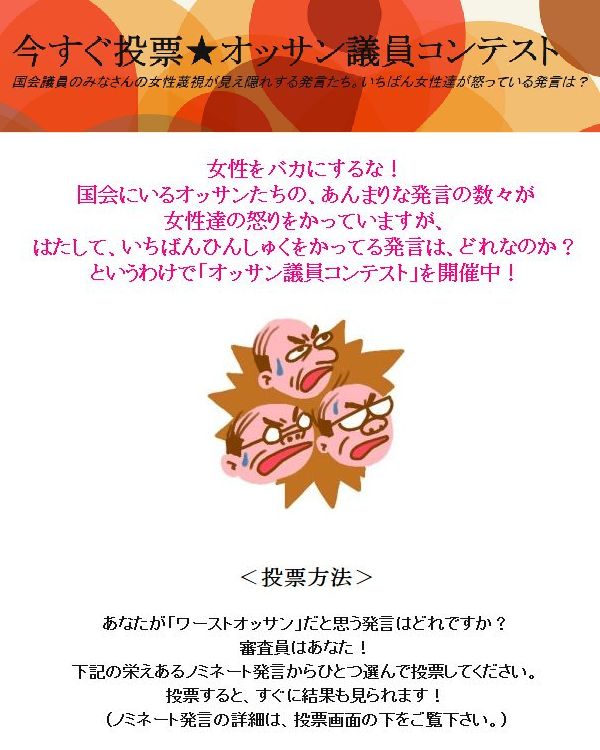 【投票を!】ネットで「オッサン議員コンテスト」が絶賛開催中!最もヒドイ女性蔑視発言をした自民党議員は誰だ!
