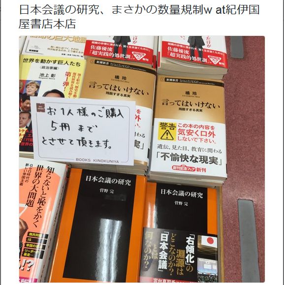 コレ、明らかに情報を流通させたくない組織が大量購入してるな。何故なら、庶民はバカ組織みたいに大量購入しない。RT @machiboni: 日本会議の研究、まさかの数量規制w at紀伊国屋書店本店 pic.twitter.com/Xzpz7GtQrx