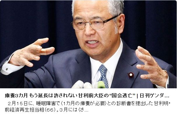 【国会に来い】ワイロ疑惑の甘利元大臣、睡眠障害の療養期間を過ぎても国会を欠席!8月の時効まで逃げ切る気か?