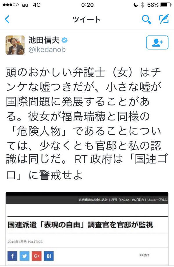 頭のおかしい弁護士(女)はチンケな嘘つきだが、小さな嘘が国際問題に発展することがある。彼女が福島瑞穂と同様の「危険人物」であることについては、少なくとも官邸と私の認識は同じだ。 RT 政府は「国連ゴロ」に警戒せよ https://t.co/pWG2wj7ECR