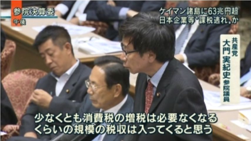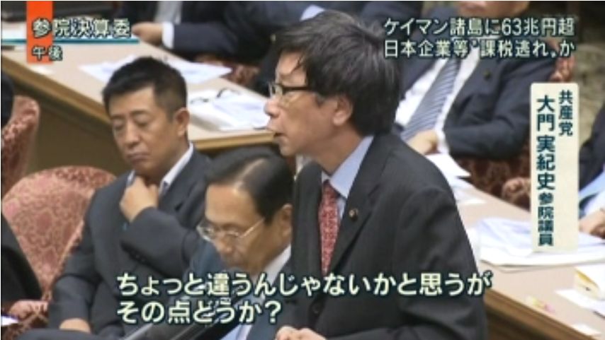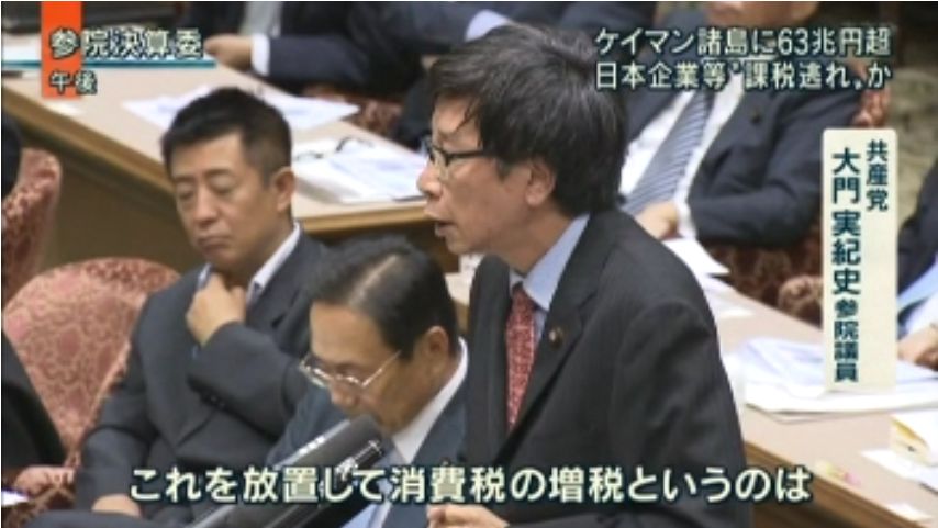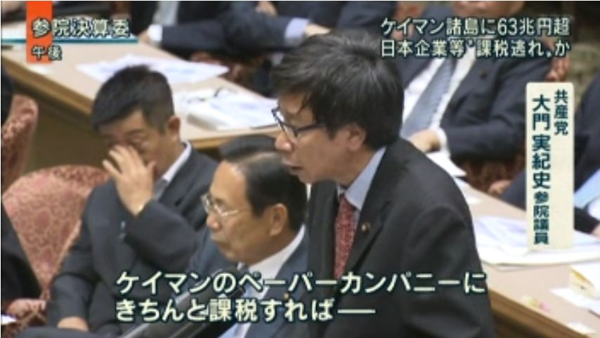 タックスヘイブンでの課税逃れ。参院で大門みきし議員が告発。ケイマン諸島への日本大企業の投資は、63兆円。ペーパーカンパニーは524社「課税すれば、消費税を増税する必要なくなる」安倍首相「税の公平性が担保されてはじめて、みなさまも税金を払う気持ちになる」。ならばこの課税が先だ。
