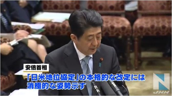 「地位協定につきましてはですね、我々、米側に対して、これはもう相手があることでございます。事実上、地位協定についてはほとんど指一本触れることができなかったのでありますが、環境の分野においてはですね、初めて、先般、この事実上のですね、新たな協定ができたと、このように思っております」(安倍首相)