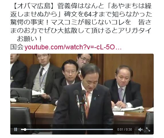 【オバマ広島】菅義偉はなんと「あやまちは繰返しませぬから」碑文を64才まで知らなかった驚愕の事実!マスコミが報じないコレを 皆さまのお力でぜひ大拡散して頂けるとアリガタイ お願い!