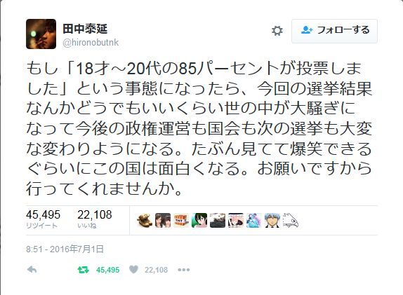 【4万5千リツイート】田中さん「もし18才〜20代の85パーセントが投票したら、爆笑できるぐらいにこの国は面白くなる。お願いですから選挙行ってくれませんか。」