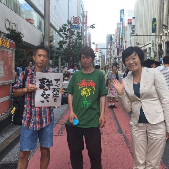 少し遅れて来た安倍首相は汗だくになりながら、いつになく早口でまくし立てた。「観光も日本の成長の柱となった。もっとお金を落としてもらうために規制緩和をした。これで社会保障の財源を確保していく」。こう話す当人に向かって「戦争反対!」と叫ぶ集団がどこからともなく現れた。