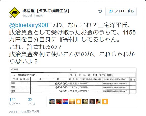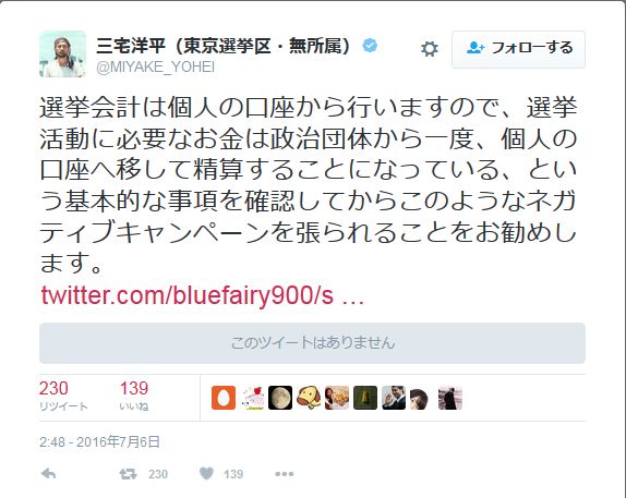 — 三宅洋平(東京選挙区・無所属) (@MIYAKE_YOHEI) 2016年7月5日