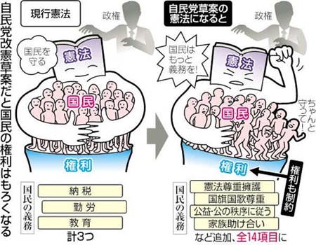 国民の皆々様はぜひ一度自民党憲法改正草案をお読みになることをオススメします〜(憲法は短いのですぐ読めます)。