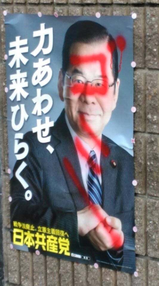 【犯罪】共産・志位委員長のポスター&民家の壁にスプレーで中傷「国のハジ」