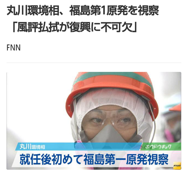 福島第一原発を塵一つ寄せ付けない完全装備で視察していた丸川珠代が「野球やソフトは福島で予選」と述べた。未だ放射能を完全にコントロールできず最早、国民を騙すしか手立てがないという状態が、2020年には解決していると誰が信じる?野球やソフトの選手たちも完全装備で戦えと言うことかな?